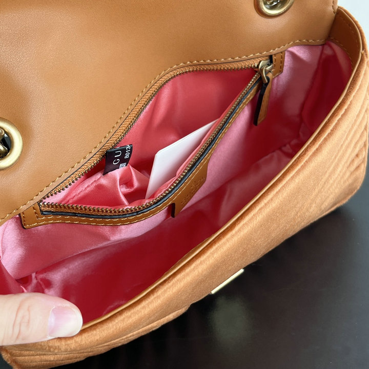 编号: 56A90J2ZC250品牌: 古驰 ( GUCCI )尺寸(size):26*15*7(W长*H高*D宽)cm 描述(Describe):升级版实拍#款号:443497天鹅绒 GG marmont天鹅绒系列,秋冬限时回货真的是时代的眼泪,对版反毛绒面料 呈现深浅色效果,对版丝绸内里、拉链式口袋内有水洗标。经典翻盖,古铜色logo双G五金和链条搭配.